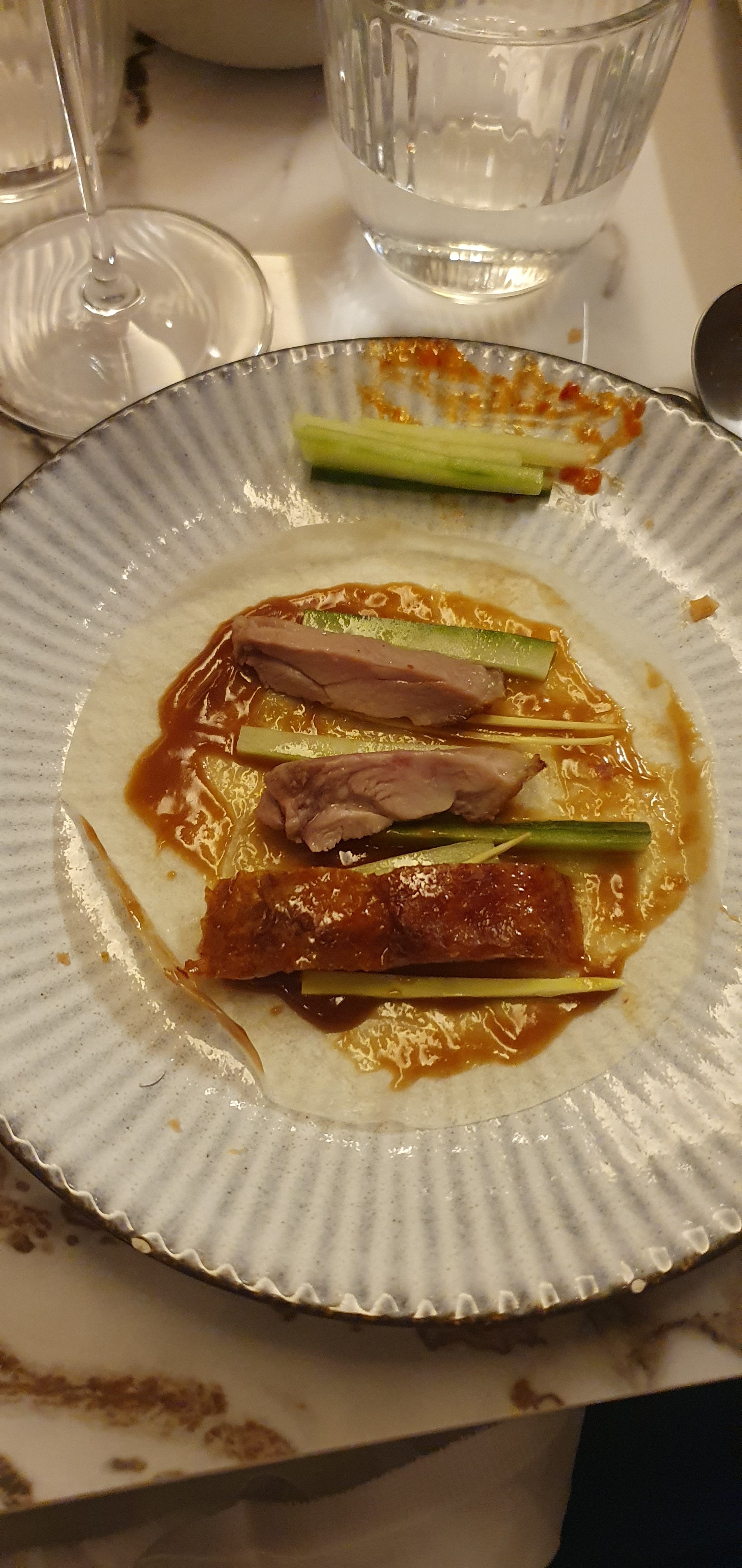 C'est rigolo: on met le canard sur une très fine crêpe, avec la sauce qui tue et légumes croquants. Ça deboite sa mère.